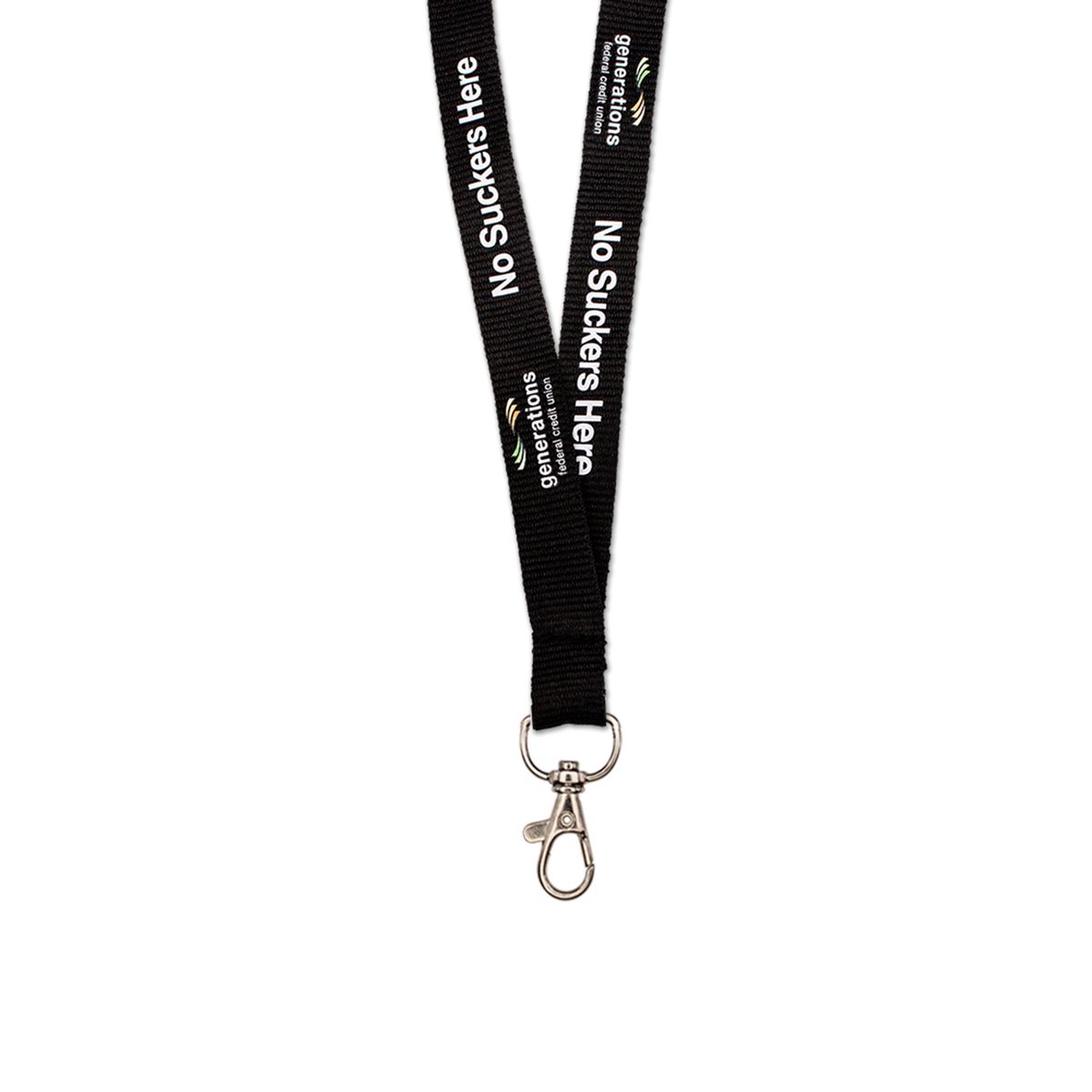 Polyester Lanyards with vibrant silkscreen imprint offer comfort and economy. Ribbed polyester lanyard material is ideal for corporate badges, promotional or event applications. One side silkscreen imprint standard. Second side imprint also available. Includes your choice of over 13 standard attachments.