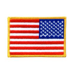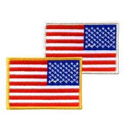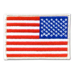 Show your patriotic pride with embroidered American Flag patches. This 3 1/2" x 2 1/2" 100% embroidered patch features a reversed USA flag design with heat seal backing and your choice of a gold or white merrowed border.